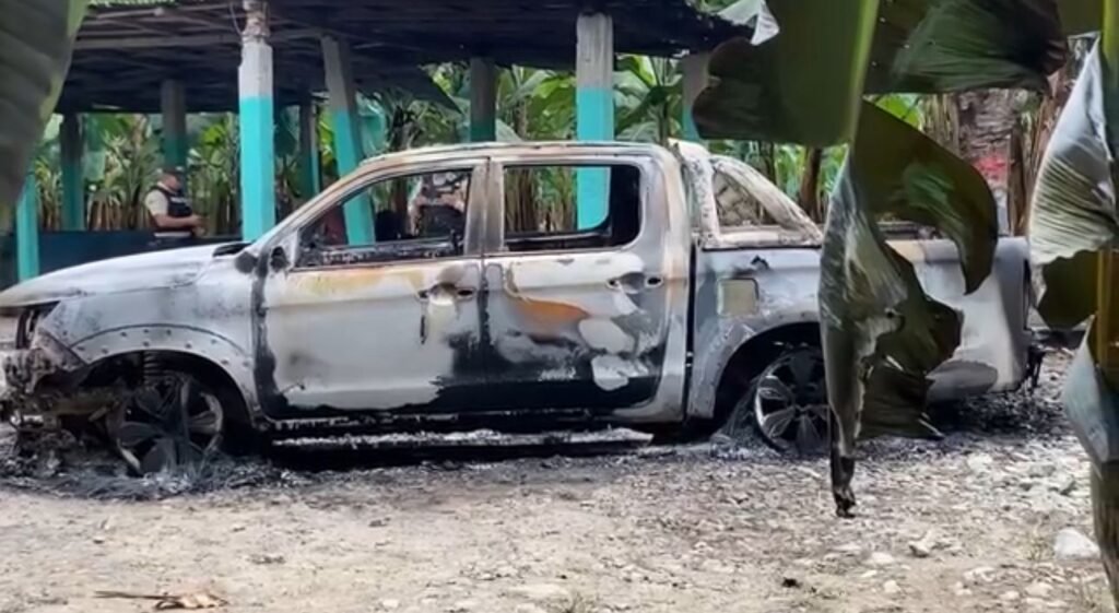 A menos de 24 horas del asesinato del cabo segundo de Policía Jimmy Andrés Espinoza Morales, las autoridades hallaron el vehículo presuntamente utilizado por los sicarios en el ataque. La camioneta gris fue encontrada la mañana de este martes 8 de julio, incinerada y abandonada en una zona bananera, a la altura de la parroquia El Cambio.