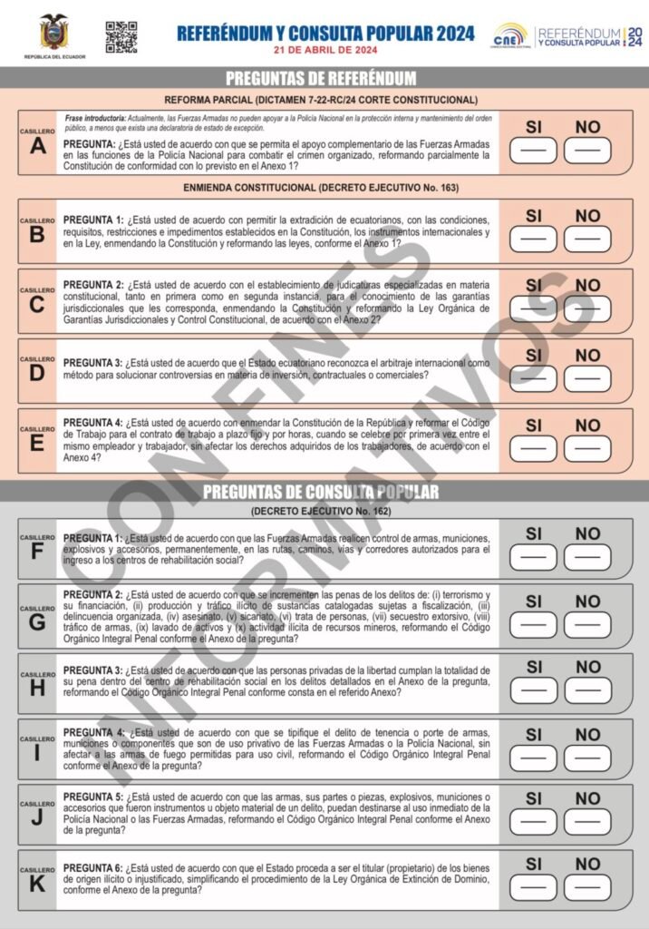 El Consejo Nacional Electoral (CNE) aprobó la papeleta para el referéndum y consulta popular del próximo 21 de abril. La papeleta se divide en dos colores: salmón y gris.