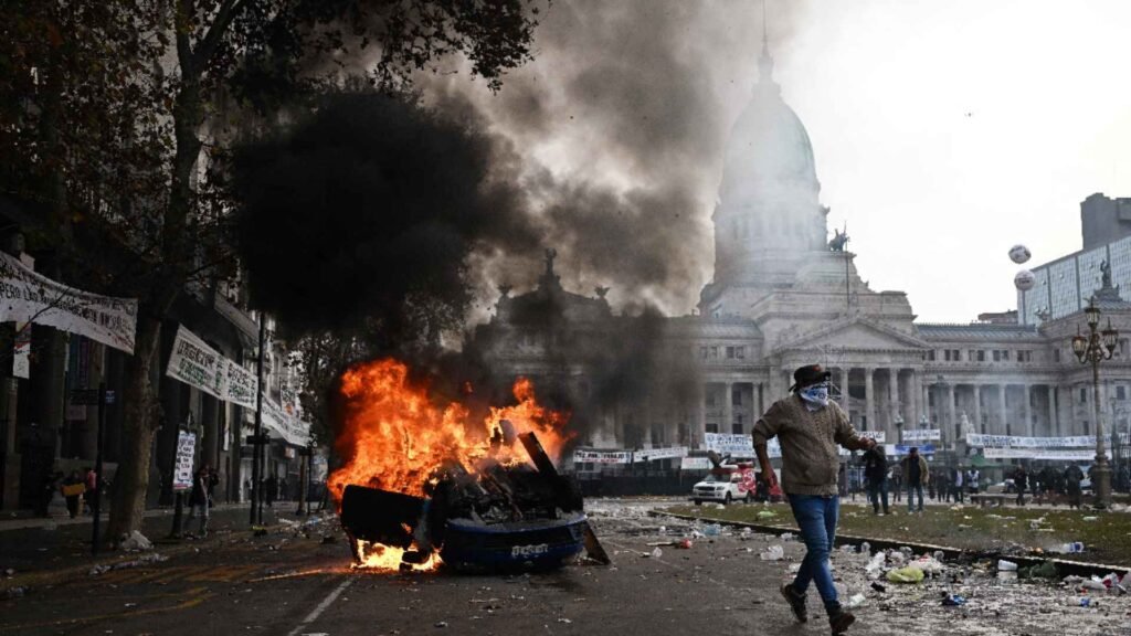 Graves incidentes entre manifestantes y la policía frente al Congreso argentino dejaron este miércoles varios heridos, entre ellos cinco diputados afectados por los gases, y autos incendiados, mientras el Senado debate un paquete de reformas crucial para el presidente Javier Milei.