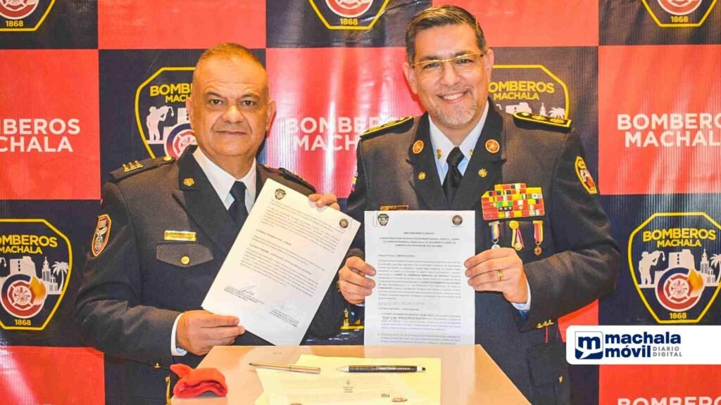 De forma paralela a la realización del Congreso de Bomberos del Ecuador, se reunieron, el Coronel Javier Astudillo Gómez, jefe del Cuerpo de Bomberos Municipal de Machala y Francisco Díaz González, comandante del Cuerpo de Bomberos Voluntarios de Cali, para la firma del Convenio Marco de Cooperación Interinstitucional entre estas dos entidades hermanas.