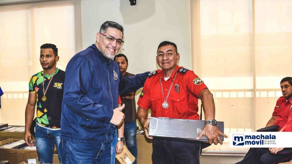 El coronel Javier Astudillo Gómez, jefe del Cuerpo de Bomberos Municipal de Machala presidió el acto de entrega de nuevas botas que cumplen con la norma NFPA 1971 y 1992 sobre conjuntos de protección para incendios estructurales y combate de incendios de proximida, destinadas al personal operativo.