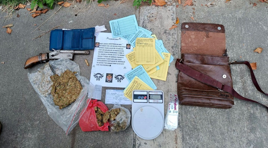 Según el informe, en poder del sospechoso se hallaron panfletos escritos con amenazas y logotipos de Los Tiguerones, un arma de fuego, municiones, tres sobres con sustancias sujetas a fiscalización y otras evidencias.