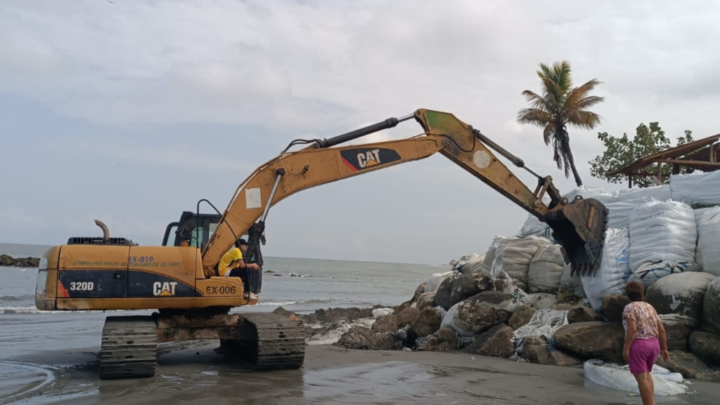 De acuerdo con los comuneros, dos maquinarias de la Prefectura de El Oro están restableciendo el muro de choque al norte de la playa turística debido a que es una zona de alto riesgo, y de llegar nuevamente el oleaje, podría causar la pérdida de 7 mil hectáreas de fauna y flora.