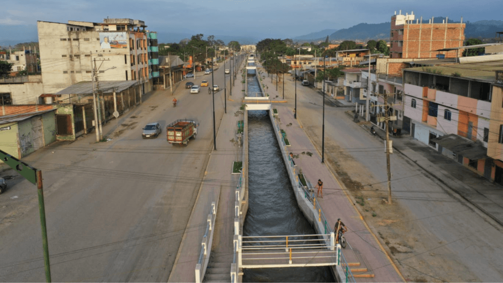 Actualmente, la estructura hídrica está revestida con hormigón, tiene pasamanos, aceras e iluminación, constituyéndose en un moderno malecón que brinda seguridad y confort.