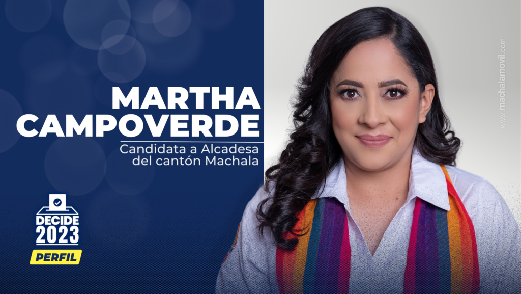 Martha Campoverde Jara de 45 años de edad, busca la Alcaldía de Machala por el Movimiento de Unidad Plurinacional Pachakutik Lista 18. Entre sus propuestas destacan la creación de la Empresa Municipal de Seguridad, reconstrucción de la Unidad Médica Dr. Pomerio Cabrera y la implementación del nuevo sistema de tratamiento de agua potable.