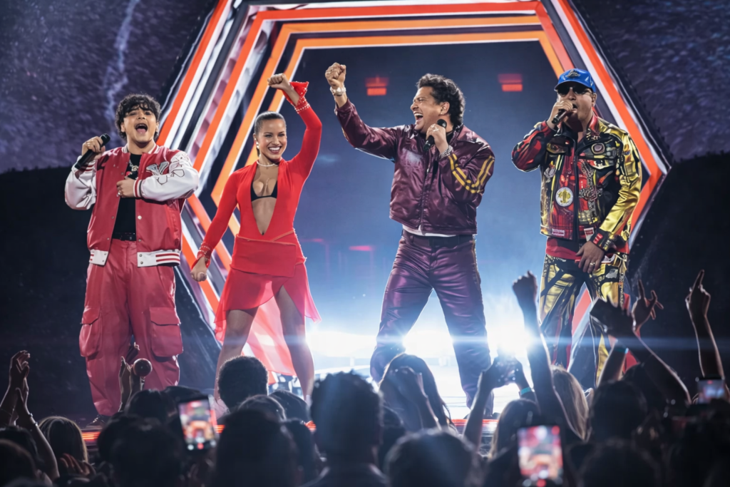 El video de la canción oficial se aleja mucho de esa decisión. «Estados Unidos, Canadá, México», enumeran Vives, Wisin y Xavi en esta edición, recordando la sede de la competencia, antes de que el tema termine con trompetas de mariachis.