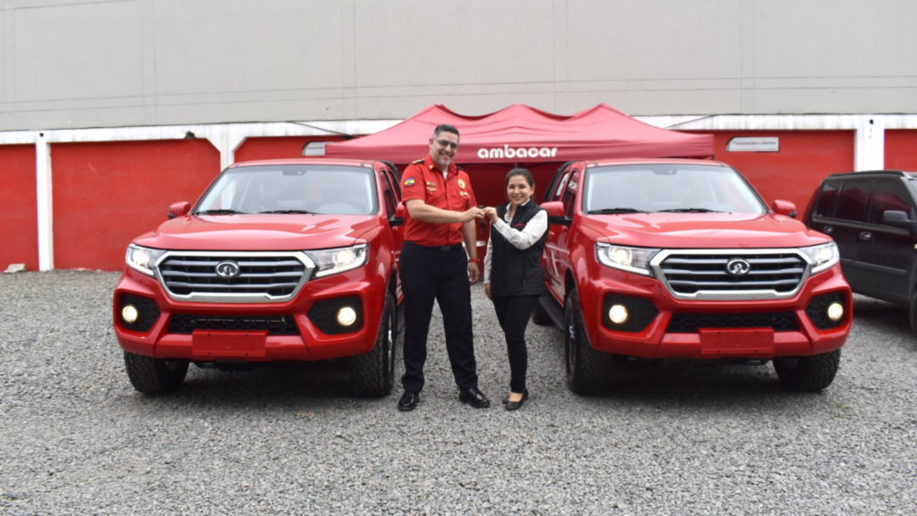Javier Astudillo, primer jefe del Cuerpo de Bomberos Municipal de Machala, recibió por parte de la concesionaria de vehículos Ambacar, dos nuevas camionetas que se sumarán al parque automotor institucional.