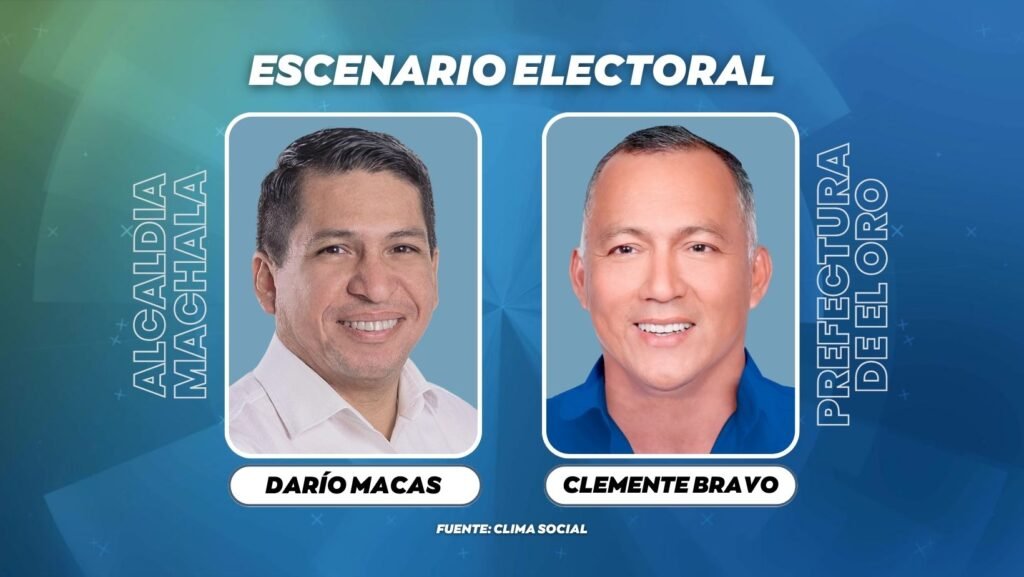 La encuestadora Clima Social, en su reciente publicación “Análisis del escenario electoral 2023”, que datan de entre el 7 y 11 diciembre, ubica a los tres candidatos con más intención del voto para la Alcaldía de Machala liderado por Darío Macas y para la Prefectura de El Oro por Clemente Bravo.