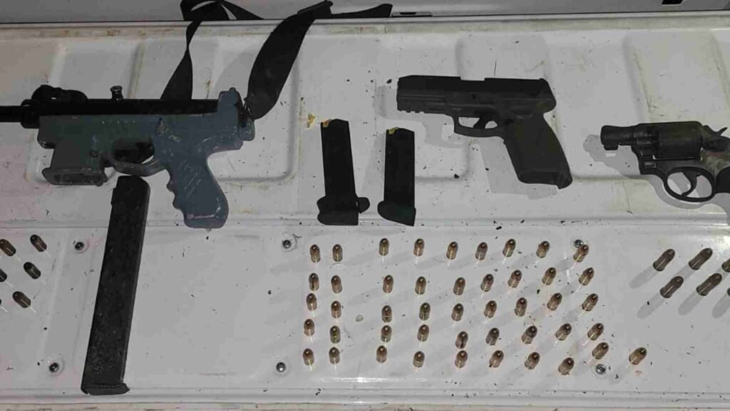 1 arma de fuego tipo pistola, marca Taurus serie AEJ734813, calibre 9mm; 1 arma de fuego tipo revolver, marca Smith y Wesson sin serie, calibre 38mm; 1 arma de fuego tipo subametralladora, marca Miniuzi sin serie, calibre 9mm; 67 cartuchos calibre 9mm; 6 cartuchos calibre 38mm y 2 terminales móviles.