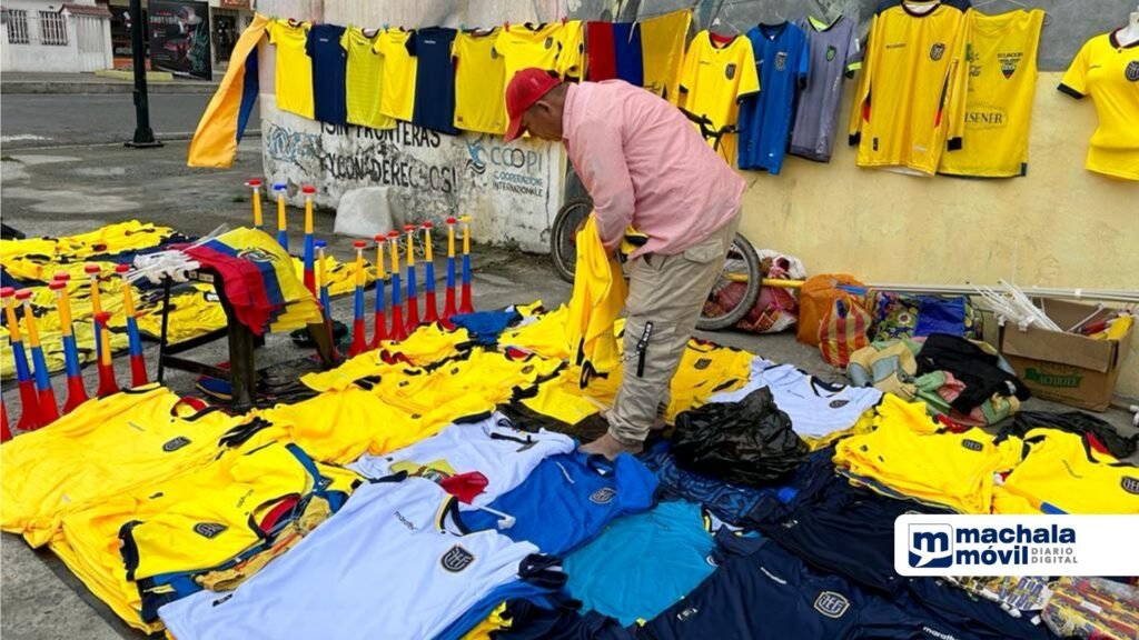 En esta ocasión, los comerciantes se ubicaron en las calles Las Palmeras y Sucre esquina, en el centro de Machala, ahí colocaron sus puestos y se encuentran vendiendo camisetas, banderas, gorros, trompetas y accesorios para autos de la selección de Ecuador.