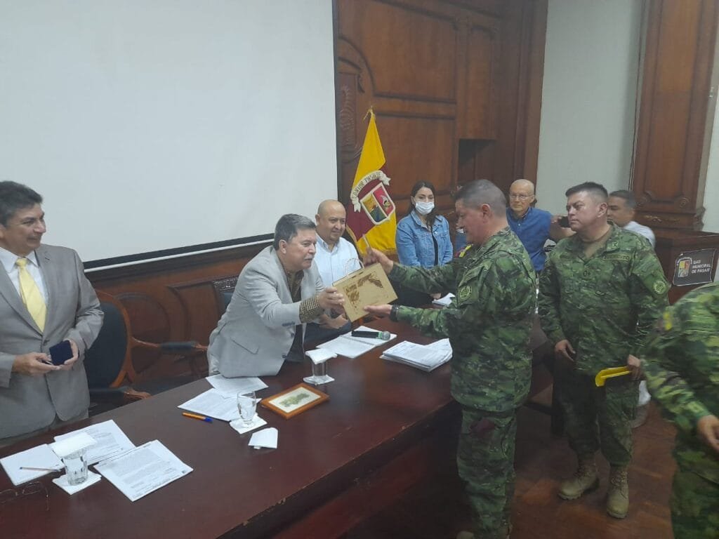 La ceremonia se cumplió en salón principal del Gobierno Autónomo Descentralizado Municipal del cantón Pasaje, con la presencia del general Gustavo Acosta Yacelga, comandante General del Ejército y César Encalada Erráez, alcalde del cantón Pasaje.