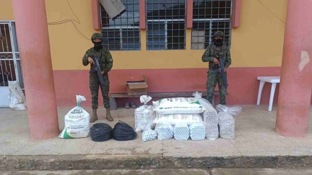 Además de los 160 tacos de explosivos (EMULSEN 5000X), entre los indicios constan: 230 kilogramos de Nitrato de Amonio, 600 metros de mecha lenta, 180 tacos de Nitrato de Amonio.