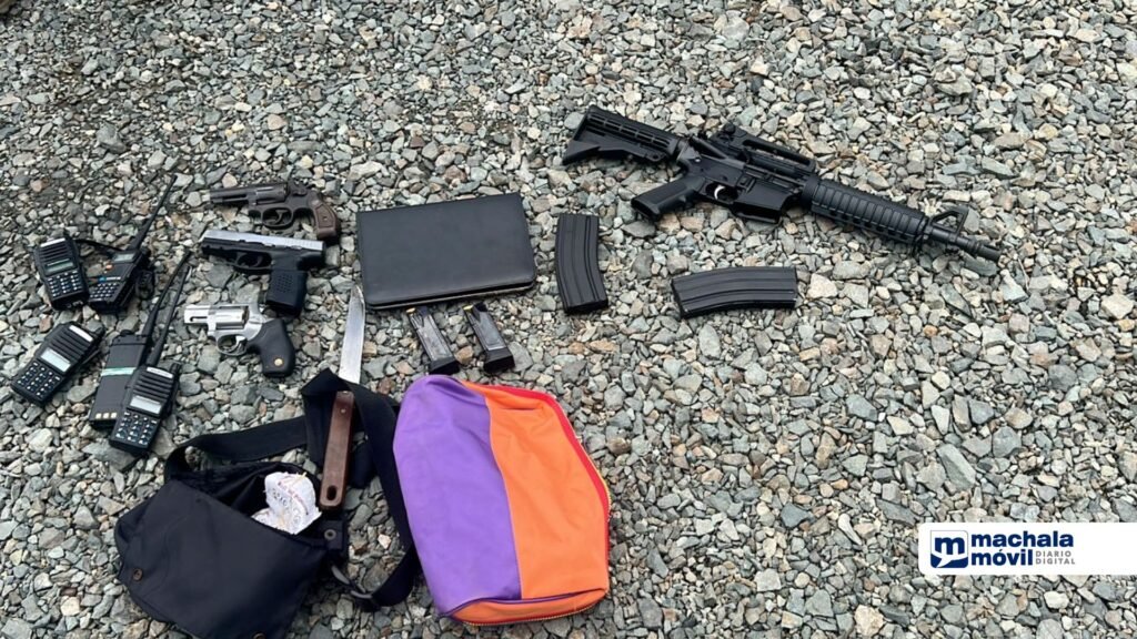 Militares y policías hallaron cinco armas de fuego en el interior de un Night Club ubicado en la avenida Circunvalación Norte, en Machala. El allanamiento estaría relacionado al robo que se registró al mediodía de este martes 20 de febrero en la escuela Simón Bolívar.