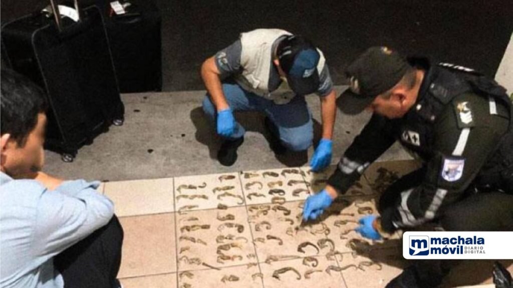 Indicó en un comunicado que el extranjero fue detenido el pasado domingo en la zona de abordaje del aeropuerto José Joaquín de Olmedo de Guayaquil, luego de que se detectaran a los caballos de mar en su equipaje de mano.