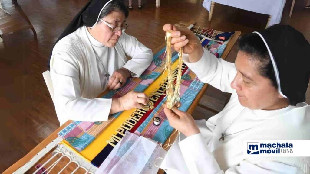 Adorna ese cuarto un cuadro de Jesús con una frase que bien podría resumir la cotidianidad de las madres: “Señor, que descubra mi soledad para luego poder colaborar contigo en la salvación del mundo”. Una hermana joven nos recibe con una amplia sonrisa y nos explica que es un día extraordinario, pues varios periodistas se han interesado en la confección de la banda que llevará el presidente Daniel Noboa en su posesión, el próximo 23 de noviembre, y que por eso han abierto las puertas de su claustro.