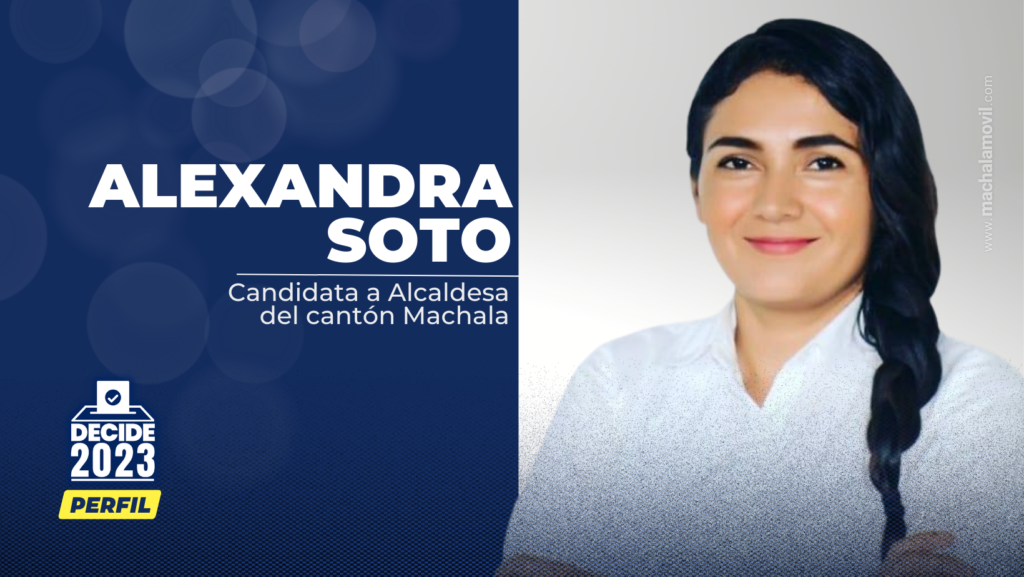 Alexandra Soto Cornejo de 41 años de edad, busca la Alcaldía de Machala por el Movimiento Democracia Sí Lista 20. Entre sus propuestas destacan promover el emprendimiento joven, creación de planta de selección y compactación de reciclaje de plásticos y promover una ordenanza que regule el uso de suelo en camaroneras.
