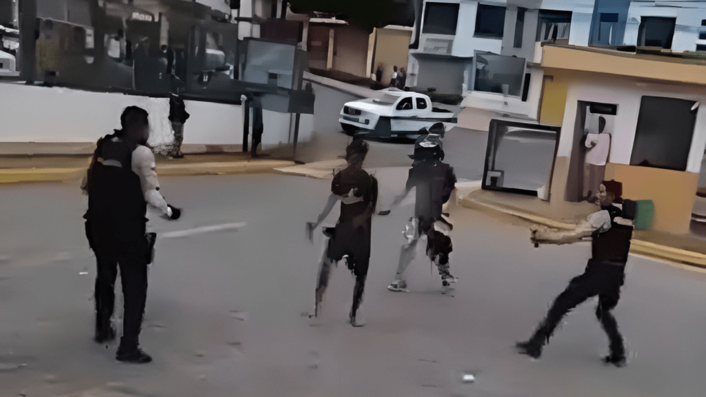 El ataque quedó registrado en un video que circuló en redes sociales. En este se observa al hombre amedrentar con un cuchillo a un grupo de policías y civiles, en un estacionamiento, hasta que uno de los uniformados saca su arma.