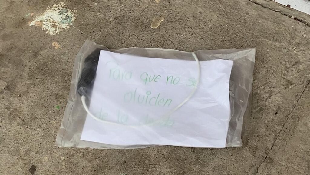 Junto al objeto se encontró una nota en la que se leía una amenaza que decía “Para que no se olviden la deuda”, mismo que causo alerta los moradores del sector.