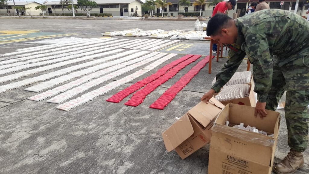 Luis Acosta, Coronel de estado Mayor indicó que entre el material decomisado se encuentran 1038 tacos de explosivos marca riodin, 451 tacos de explosivos marca famesa.