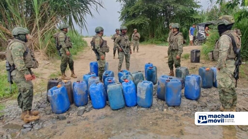 En horas de la mañana de este lunes, 26 de junio, se efectuaron operaciones militares en el sector de La Isla, ubicado en el cantón Huaquillas, en donde se decomisaron 208 galones de diésel que se encontraban en una tricimoto.