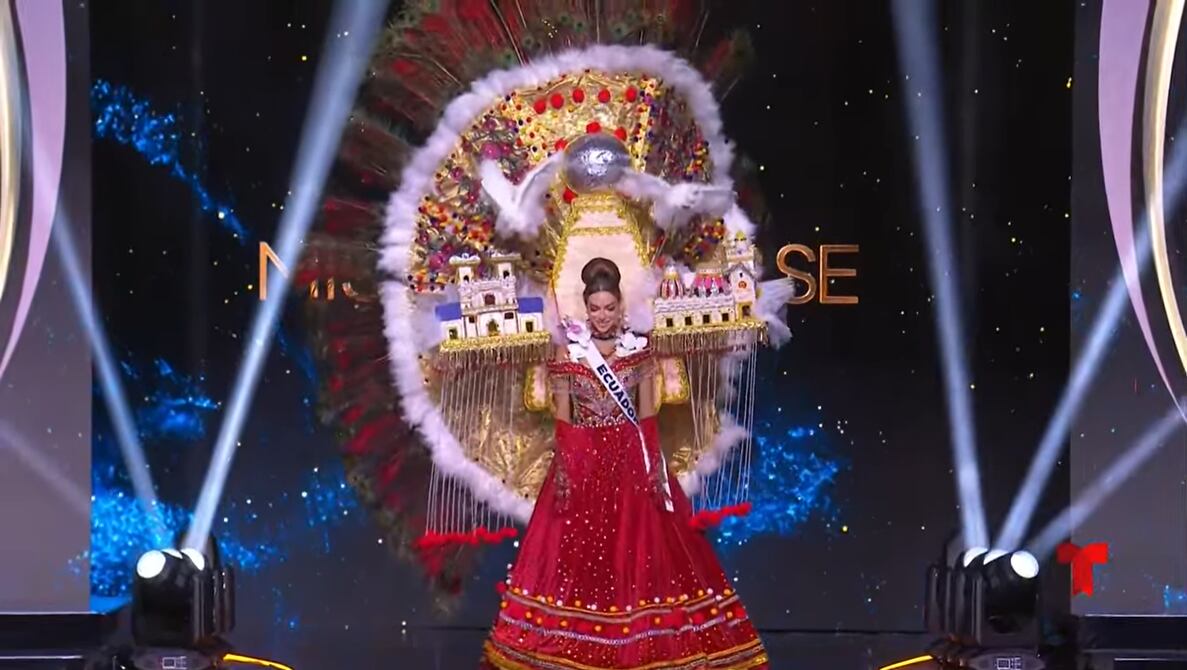 La candidata ecuatoriana Mara Topic recorrió el escenario cuando fue su turno con sus tres vestidos. El primero fue el traje nacional, que estuvo inspirado en Centro Histórico de Quito, con estructuras de las iglesias San Francisco y Santo Domingo como su punto focal. Además la frondosa falda que le acompañó se puso abrir para mostrar escenas de las cuatro regiones del territorio.
