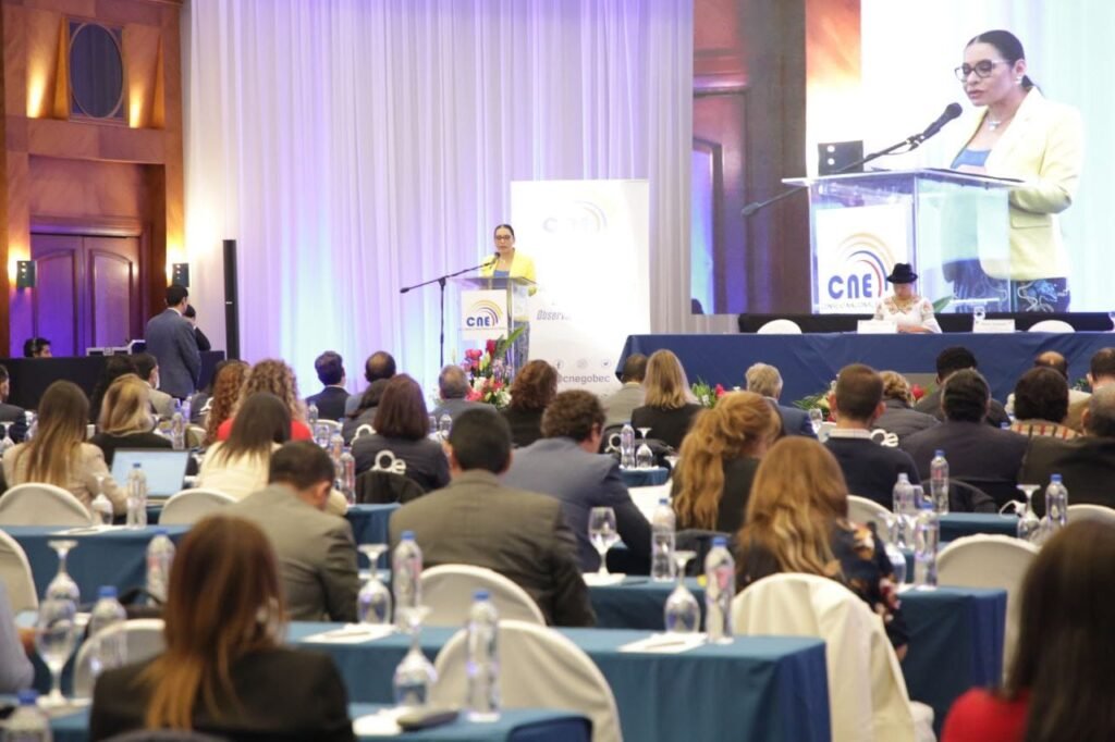 Integrantes de las Misiones de Observación Electoral de organismos internacionales participan en una capacitación sobre diferentes aspectos y procesos de las Elecciones Seccionales, del Consejo de Participación Ciudadana y Control Social (CPCCS) y Referéndum 2023. La presidenta del Consejo Nacional Electoral (CNE), Diana Atamaint, junto al vicepresidente de la institución, Enrique Pita García y la consejera, Esthela Acero, participaron en la jornada realizada el 1 de febrero.