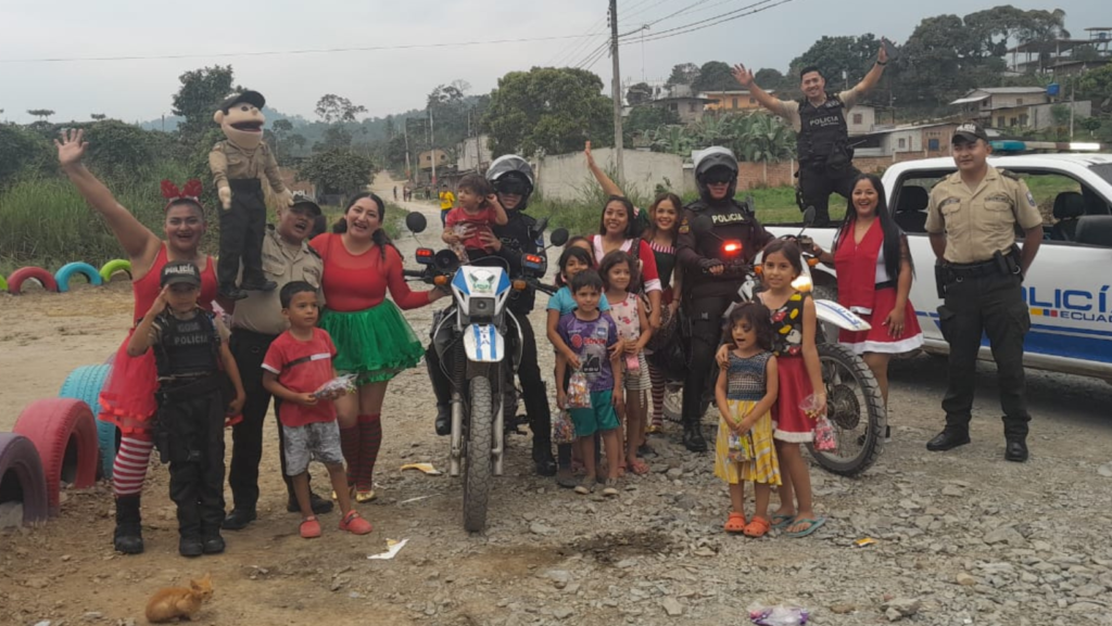 En compañía de Paquito Policía, miembros de la Policía Nacional realizaron la entrega de juguetes y fundas de caramelos a los niños y niñas de varios sectores en el cantón Pasaje.