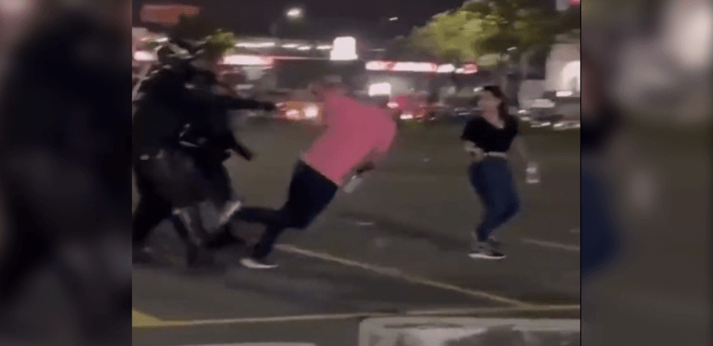 Después, se ve a un hombre que aparece detrás de los uniformados y toma a la mujer policía del hombro y trata de detenerla. Inmediatamente, otro policía empuja al ciudadano por la espalda y este se cae. Al final, otro ciudadano se acerca a precipitada carrera.