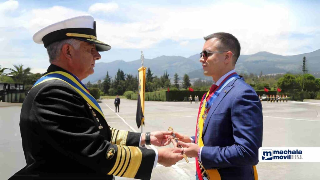 El presidente Daniel Noboa recibió este martes 27 de febrero el bastón de mando por parte de los militares. La entrega se realizó en la Escuela Superior Militar Eloy Alfaro, en Quito, durante la ceremonia de conmemoración por los 195 años de la Batalla de Tarqui, Día del Ejército Ecuatoriano, del Civismo y la Unidad Nacional.