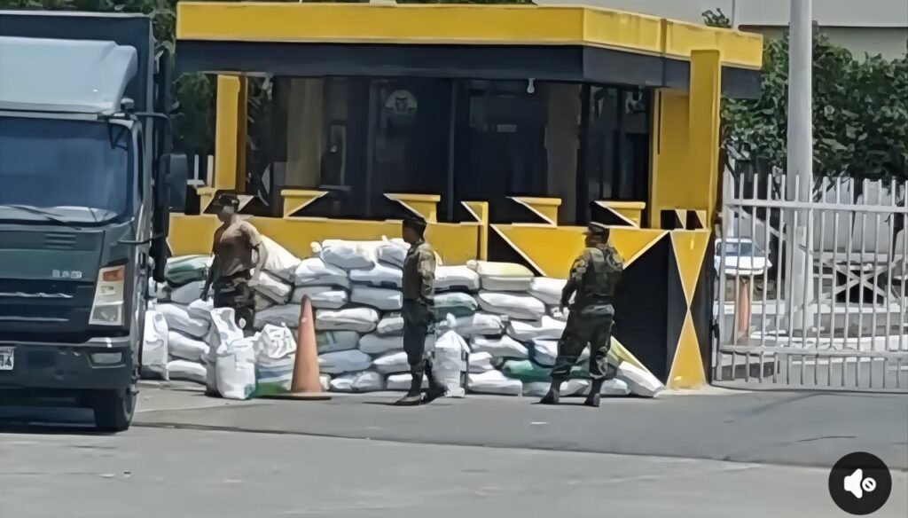 La mañana de este viernes, personal de la Brigada de Infantería Motorizada N.º 1 “El Oro” levantó barricadas de sacos de arena en el ingreso principal del Fuerte Militar Héroes de Chacras, en Machala. El despliegue llamó la atención de transeúntes y conductores que circulaban por las calles Arízaga y Bolívar, diagonal al ECU 911, quienes observaron cómo uniformados descargaban decenas de sacos desde un camión para apilarlos en la puerta del cuartel.
