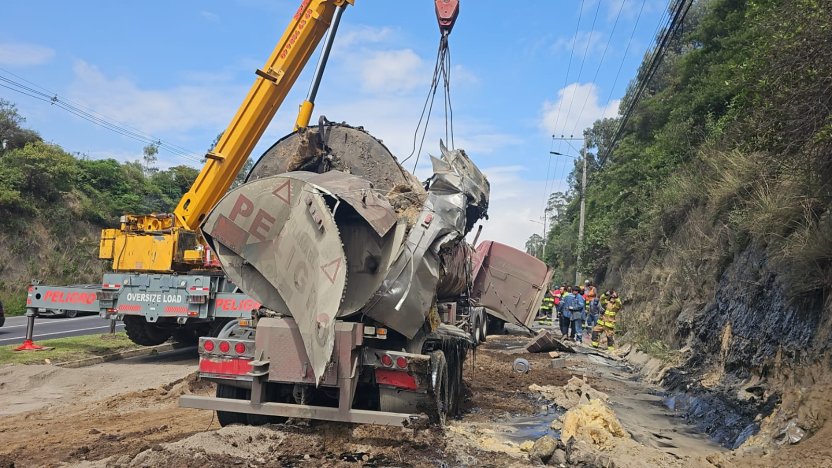 Tráiler con 10.000 galones de brea se volcó en sector Llano Chico, en Quito