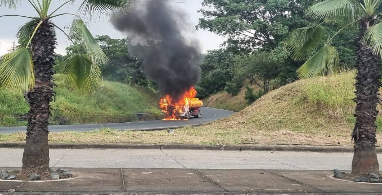 En videos y fotos divulgados en redes sociales se ve que el vehículo está en llamas. Parte del cabezal del tanquero de combustible ardió.