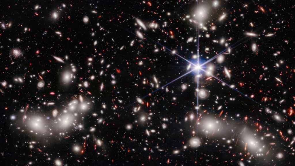 El telescopio espacial James Webb ha desvelado detalles nunca antes vistos de una región del espacio conocida como Cúmulo de Pandora; la imagen muestra tres cúmulos de galaxias, ya de por sí masivos, que se unen para formar un megacúmulo.