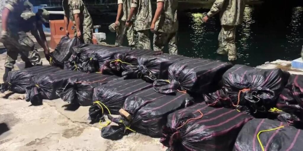 La Policía Nacional y las Fuerzas Armadas interceptaron a tres hombres que transportaban 1.3 toneladas de cocaína en un bote que estaba en aguas de las Islas Galápagos.