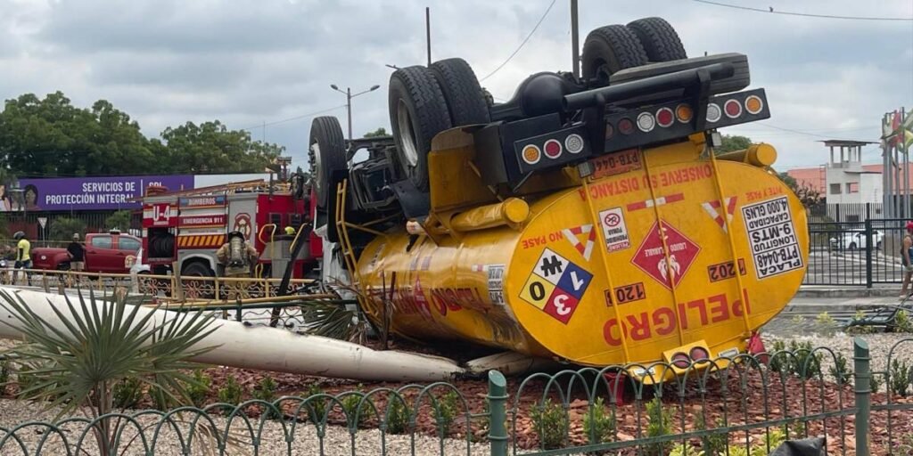 Un aparatoso siniestro de tránsito se registró pasado el mediodía de este martes 8 de julio en Durán, en el ingreso a ese cantón desde la ciudad de Guayaquil. Un camión cisterna que transportaba combustible terminó volcado contra un letrero. Adicionalmente, un vehículo liviano está involucrado y hay al menos dos personas heridas.