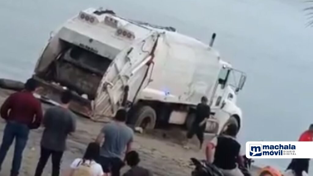 Hasta el sitio se movilizó un camión recolector, mismo que al intentar brindar ayuda también terminó atrapado en la arena, debido a la subida de marea.